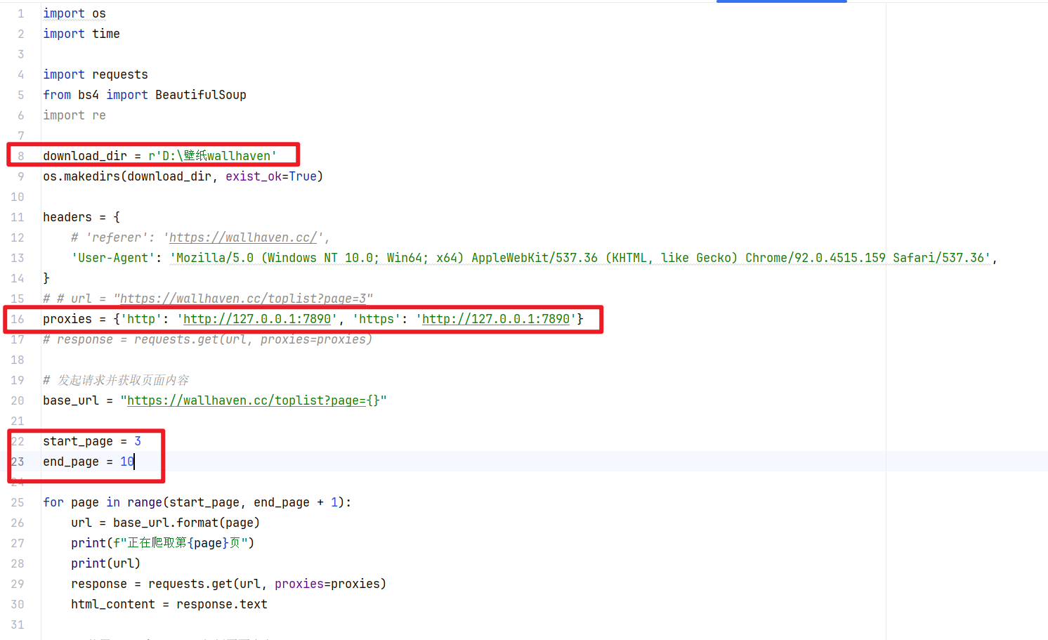 base_url = "https://wallhaven.cc/toplist?page={}" start_page = 3 end_page = 10 for page in range(start_page, end_page + 1): url = base_url.format(page) print(f"正在爬取第{page}页") print(url) response = requests.get(url, proxies=proxies) html_content = response.text soup = BeautifulSoup(html_content, "html.parser") preview_links = soup.find_all("a", class_="preview") for link in preview_links: href = link.get("href") print("======================================") print(href) time.sleep(1) try: response_2 = requests.get(href, proxies=proxies) soup = BeautifulSoup(response_2.text, "html.parser") wallpaper_img = soup.find("img", id="wallpaper") src_link = wallpaper_img.get("src") print(src_link) file_name = src_link.split("/")[-1] print(file_name) response = requests.get(src_link, proxies=proxies) if response.status_code == 200: with open(os.path.join(download_dir, f"{file_name}"), "wb") as f: f.write(response.content) print("图片下载成功!" + src_link) else: print("下载失败,状态码:", response.status_code, '"', src_link, '"') except Exception as e: print("爬取失败:", e) continue