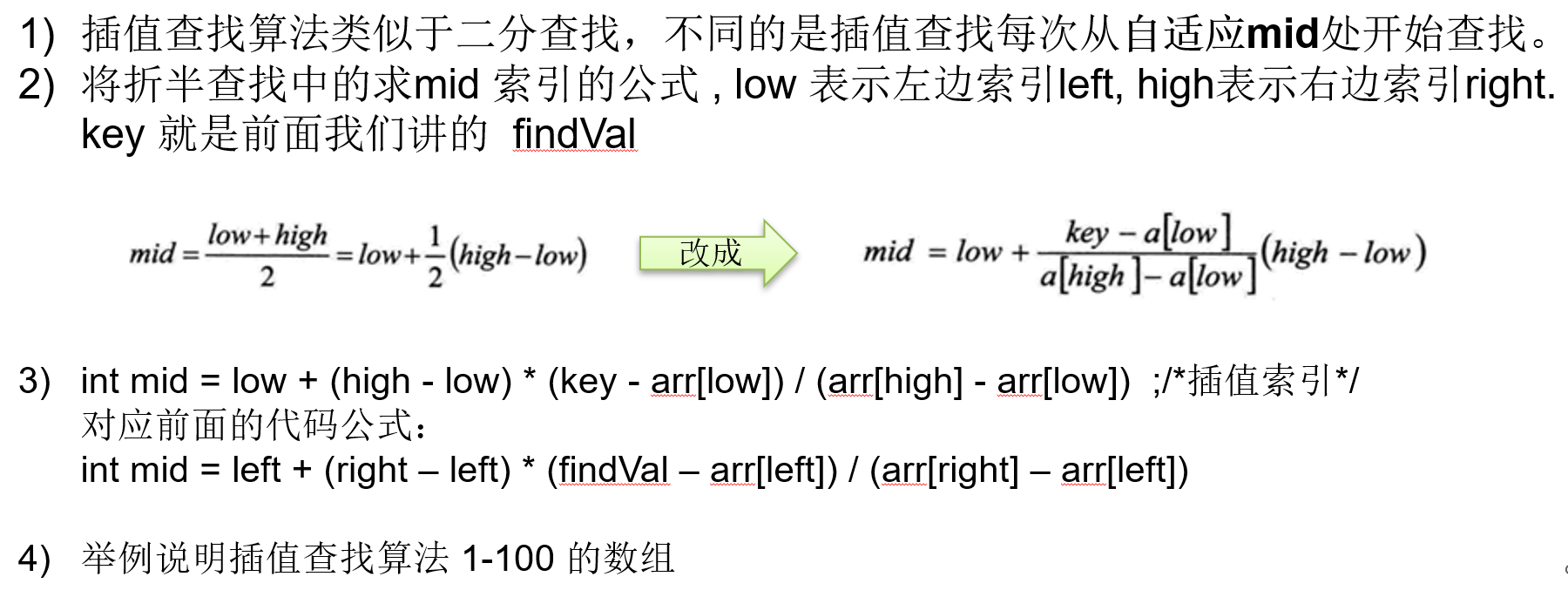 int mid = left + (right - left) * (findVal - arr[left]) / (arr[right] - arr[left]);