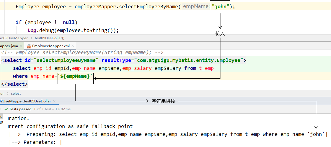 ${}形式传参,底层Mybatis做的是字符串拼接操作。